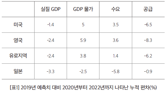 그렇다면 왜 다른 나라에 비해 미국과 영국이 수요충격이 두드러지게 큰가. 첫째, 코로나19 위기가 발발한 2020년에 미국과 영국은 통화정책을 확연히 완화한 반면, 유로지역과 일본에서는 통화정책의 변화가 거의 없었다. 둘째, 모든 국가가 코로나19에 대처하기 위해 대규모 재정지출을 실행했으나, 미국의 재정지출은 가계에 대한 직접 이전이 컸고 가계는 그 이전액을 지출했다. 반면 일본의 경우, 가계가 코로나19 대유행 기간에 지출을 삭감했다. 영국은 공급충격이 가장 큰데, 브렉시트를 빼놓고 생각할 수 없다. 브렉시트로 인해 무역이 제한되고 비용이 증가함에 따라, 성장이 감속하고 인플레이션이 상승하는 결과를 초래했을 것이다.