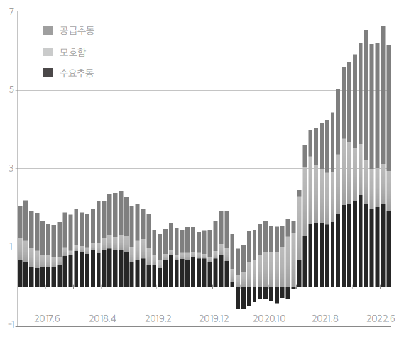 그래프를 통해서 인플레이션 추이가 시간이 흐르며 어떻게 바뀌었는지 확인할 수 있다. 코로나19 대유행 상황에서 2020년 전반기부터 나타난 인플레이션율의 하락은 수요 요인의 감소 때문이었다. 또한 2021년 3월부터 시작한 인플레이션율의 상승은 주로 수요요인의 증가 때문이었다. 이때부터 경제활동이 재개되었고, ‘미국구제계획’(1.9억 달러에 달하는 바이든 행정부 경기부양 계획)이 제정되어서 수요 요인을 더 강화했다. 이러한 요인은 델타 변이 바이러스와 관련된 감염확산으로 인해 2021년 여름에 약화되기 시작했지만, 델타 변이 바이러스가 누그러진 가을에 재부상했다.