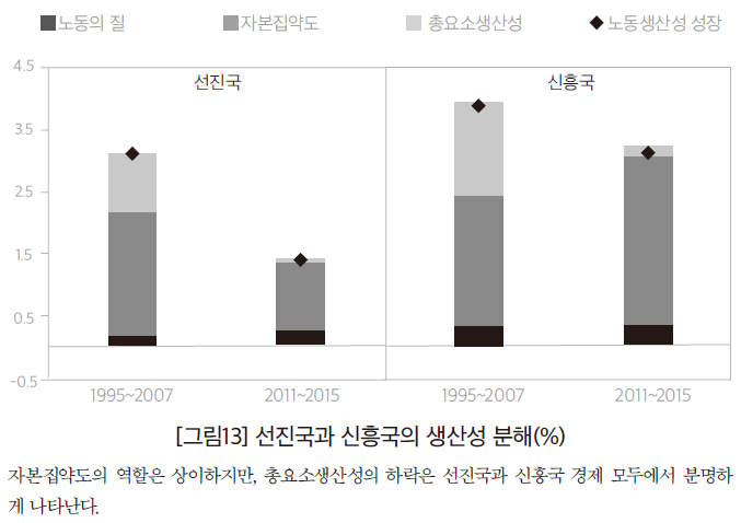 세계적인 생산성 하락은 신흥국으로서도 매우 어두운 소식이다. 역사를 살펴보면, 신흥국과 미국 사이의 1인당 GDP 격차는 좁혀졌지만 이는 대부분 신흥국의 빠른 물적, 인적 자본 축적에 따른 결과였다. 사실 신흥국의 총요소생산성 성장은 미국보다도 느렸다. 신흥국의 생산성 상승은 선진국의 생산성 상승과 밀접한 상관관계가 있으며, 아마도 대체로 무역과 관련된 파급효과에 기인한 것이다. 따라서 선진국의 생산성 상승세가 둔화하면 신흥국은 이미 어려운 상황이 더 어려워질 수 있다. 신흥국이 생산성 상승을 가속할 수 없다면 선진국의 생활수준을 추격하는 일은 매우 힘들어질 것이다.