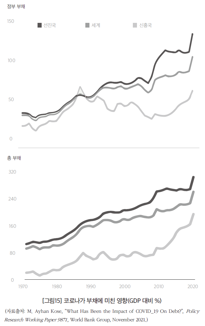 네 번째로, 우발부채를 보자. 1990~2014년, 80개국에서 우발부채의 현실화로 GDP 대비 평균 6%의 채무가 확대되었다. (최고 기록은 아시아 위기 당시 인도네시아로, GDP 대비 57%가 늘었다.) 한국은 우발부채와 관련된 재정비용이 GDP의 31.2%에 달한다. 일반적으로 말하면, 노동생산성 하락과 연결된 GDP 성장률 하락은 GDP 대비 우발부채의 비중이 커진다는 의미를 지닌다. 또한 이자율 하락은 위기가 발생할 때 통화정책의 효과를 떨어뜨린다. (피터슨국제경제연구소의 글은 코로나 위기 발생 이전에 쓰인 글로, 코로나 위기가 또다시 대규모의 정부 부채를 축적한 계기가 되었다는 사실을 잊지 말아야 한다.)