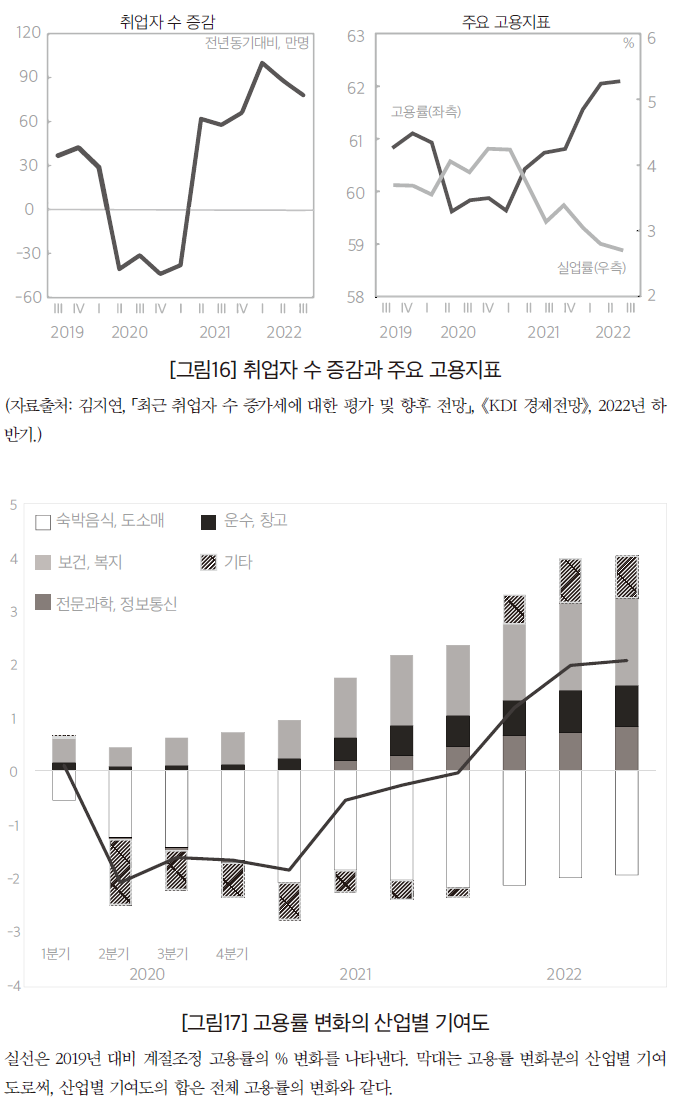 다만 경기회복세가 약화하고 있음에도 2022년 고용은 ‘양호한’ 흐름을 보인다. 고용률이 높은 수준으로 빠르게 상승하고, 실업률도 장기추세를 크게 하회하여 경기상황과 대조적인 흐름을 보여서 그 원인을 따져볼 필요가 있다. 최근 고용 확대에 가장 기여한 업종은 ▵전문과학, 정보통신, ▵운수창고업, ▵보건업, 사회복지 서비스업으로 나타났다. 이러한 업종은 코로나 위기와 밀접한 관련이 있다. 비대면 경제로 전환하는 과정에서 배달 관련 인력수요가 빠르게 증가했고, 디지털화가 가속화되면서 정보통신 관련 일자리도 증가했다. 물론 방역과 돌봄 인력에 대한 수요도 증가했다. (반면 숙박, 도소매와 같이 코로나 위기의 직격탄을 맞은 업종은 아직도 뚜렷한 회복세를 보이지 못하고 있다.)