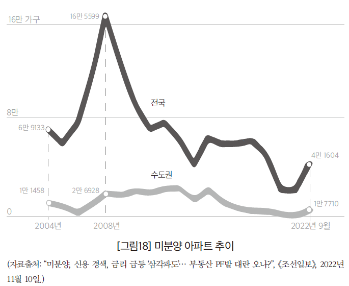 한국은행은 이미 9월 22일에 발표한 「금융안정 상황」에서 비은행권의 프로젝트 파이낸싱 대출의 “건전성이 저하될 수 있다”고 평가했다. 2011~2013년 부동산 PF대출 부실사태 후, 은행권은 PF대출을 크게 늘리지 않았지만, 비은행권, 즉 저축은행, 증권사, 여신전문회사는 이를 대폭 확대했다. 2014년부터 2022년 6월까지 증가액을 보면 은행은 6.9조 원인데 반해, 비은행권은 70.1조 원에 이르렀다. 또한 은행과 보험사의 대출은 대형사업장의 아파트를 중심으로 하지만, 저축은행과 증권사, 여신전문회사는 중소규모 사업장의 아파트 외 주택, 상업시설을 중심으로 했다. 게다가 PF대출 관련 유동화증권 발행이 증가하면서 증권사의 채무보증도 크게 증가했다. 따라서 주택가격이 하락하면, 비은행권의 PF대출 부실이 확대될 수밖에 없었다.