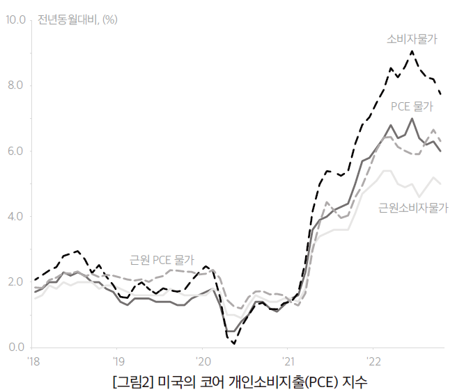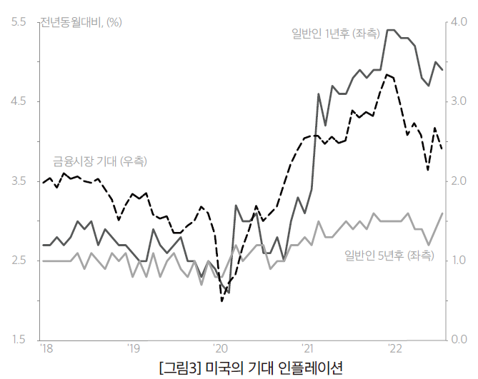 가장 최근의 상황을 보면, 2022년 10월 중 단기(1년) 기대인플레이션이 7개월 만에 상승세로 돌아서고, 장기(5년) 기대인플레이션도 4개월 만에 다시 상승하였다. 이를 반영하여, 한국은행의 보고서, 「최근의 미국경제 상황과 평가」(2022.11.)는 “적극적인 통화긴축에도 불구하고 서비스관련 가격은 오히려 상승세가 확대되고 기대 인플레이션까지 오르는 등 높은 인플레이션 지속 가능성이 커진다”고 평가했다. 현재 조건을 볼 때, 연준의 금리인상 속도와 폭이 온건해질 것이라고 예상하기가 쉽지 않다.