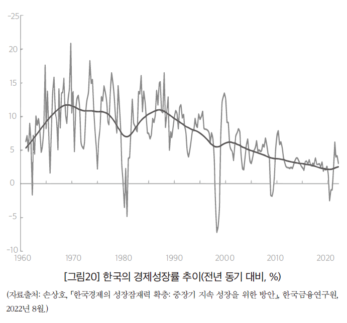 다양한 연구에서 제시되는 성장률 하락에 대한 진단과 대책은 사실 모두 대동소이하다. 문제는 한국경제의 생산성을 높이기 위한 어떤 대책이든 단기적 처방으로 해소될 수 없는 중장기적 과제라는 사실에 있다. 경제성장론의 관점에서는 경제의 개방성을 높여야 한다, 교육과 연구개발을 혁신해야 한다, 기업활동과 노동 관련 규제 제도를 바꿔야 한다 등등 과제는 제시된다. 이러한 과제는 모든 노력을 기울여도 달성하기가 어렵다. 게다가 실제 현실에서는 ‘정치적 실행가능성’이라는 문제가 개입하므로, 급격한 변화를 꾀하기 어렵다.