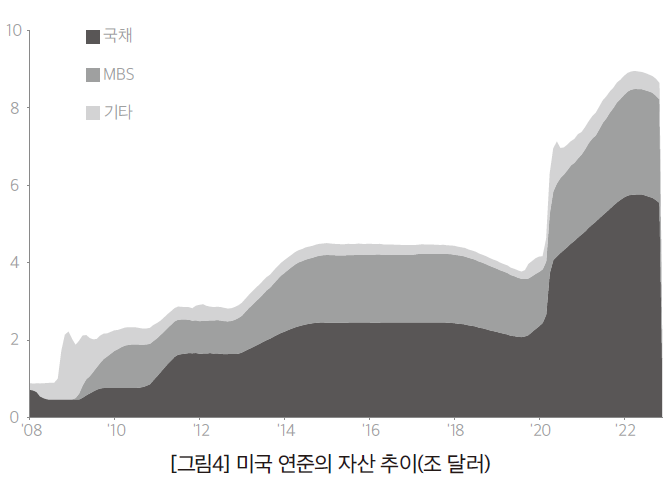 2022년 5월 연준의 연방공개시장위원회는 0.5%p의 금리인상(빅 스텝)을 단행하면서, 동시에 양적 긴축(quantative tightening, QT)을 실시한다고 공식화했다. 여기서 양적 긴축은 양적 완화(quantative easing, QE, 수량 완화)의 반대라고 볼 수 있다. 양적 완화 정책은 연준이 시장에서 국채나 주택저당증권(MBS)을 매입함으로써, 긴급하게 유동성을 주입해 채권금리를 낮추고 금융시장의 안정을 도모하는 정책을 뜻한다. 반대로 양적 긴축은 보유자산의 재투자 중단이나 보유자산의 매각을 통해 연준의 자산과 부채(즉 대차대조표 규모)를 줄이는 정책을 뜻한다. 이럴 경우 시중의 유동성을 흡수하고, 채권의 금리를 높인다.