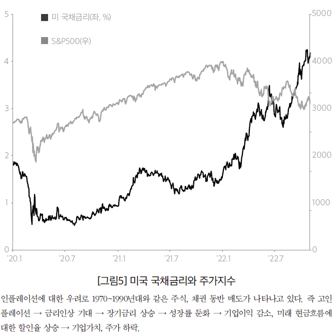 2023년 전망을 보면 수출 부진, 설비투자와 건설투자 부진이 직접적으로 경제성장률을 끌어내리는 요인이 될 것으로 보인다. 여기에 부동산 시장 하방압력이 미치는 다각적인 파급효과가 있다. 프로젝트 파이낸싱 대출 부실이 기업어음이나 회사채 시장을 압박하고, 여기에 대응하기 위한 채권시장안정펀드는 다시금 은행채 발행을 늘려 회사채 시장을 압박하여, ‘아랫돌을 빼서 윗돌로 괴는’ 상황이 연출될 수 있다. 또한 주택담보대출 금리인상에 따른 정부의 정책대응 역시 채권시장을 압박하는 효과를 발휘할 수 있다. 이를 종합하면 경기침체, 금리인상이 장기화될 경우 자금시장 경색, 기업의 재무 상황 악화가 위험 수위에 오를 수 있다는 뜻이다.