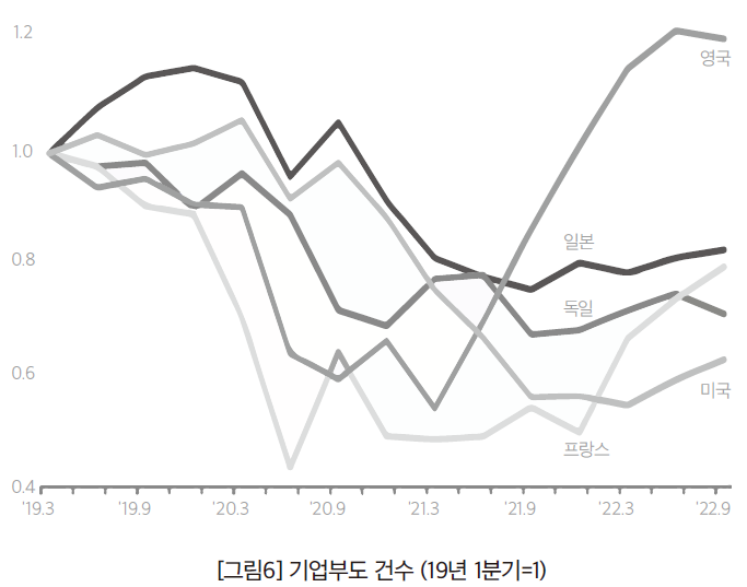 국제금융센터가 발표한 「주요국의 기업부도 증가와 전망」(2022.11.22.)에 따르면, 주요국의 기업부도 건수는 코로나 발생 이전보다 대체로 낮은 수준이지만, 올해 2분기 이후 중소기업을 중심으로 점차 증가하는 모습이 나타나고 있다. 지난 10여 년간 이어진 저금리 여건에서 존속할 수 있었던 한계기업, 중소기업이 재정, 통화정책의 동시적 긴축과 경기둔화의 영향을 크게 받을 수 있다. 또한 회사채의 디폴트가 증가할 경우, 채권시장의 불안이 확대될 것이다.