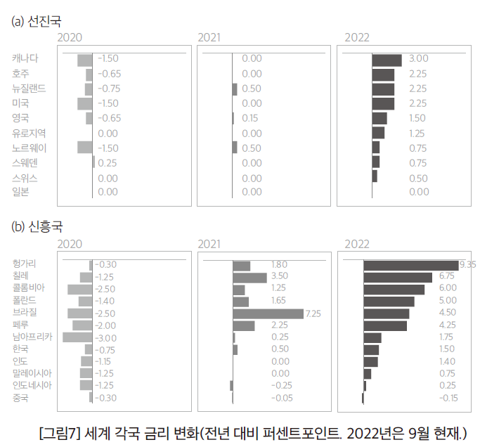 다른 한편, 피터슨국제경제연구소의 모리스 옵스트펠드는 「세계적 조정이 없는 통화정책이 역사적인 세계적 경제둔화라는 위험을 낳는다」(2022.9.12.)에서 미국 통화정책의 국제적 측면을 분석한다. 먼저 그는 1980년대의 반인플레이션 정책이 ‘근린궁핍화’(beggar-thy-neighbor), 즉 이웃국가를 가난하게 하는 효과를 발휘했다고 평가한다. 예를 들어, 미국이 이자율을 올리면, 한국의 통화는 그에 대비해 가치가 하락한다. 한국의 수출이 미국 통화로 이루어진다면, 한국의 수입물가가 올라갈 것이다. 즉 미국의 통화 긴축은 인플레이션을 무역상대국에 수출함으로써, 근린궁핍화 효과를 냈다는 뜻이다.