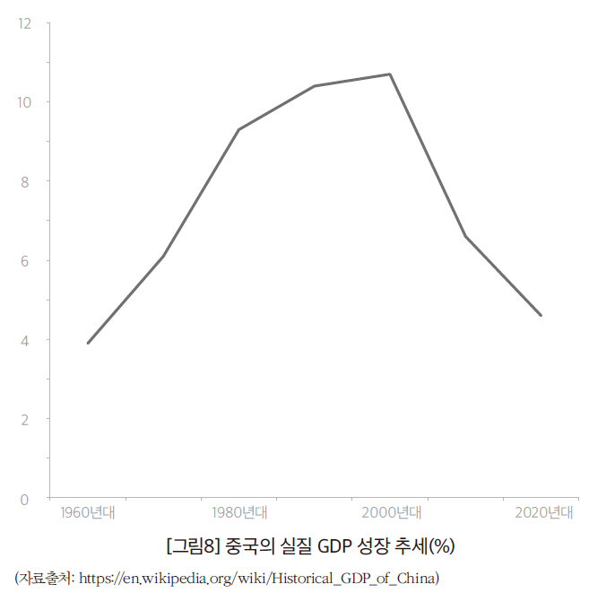 한국은행은 「경제전망」(11.24)에서 제로코로나 지속, 부동산 시장 침체로 경기부진이 당분간 이어지리라 전망했다. 올해 중국의 (전년동기대비) GDP 성장률은 1/4분기 4.8%, 2/4분기 0.4%, 3/4분기 3.9%를 기록했다. 한국은행은 내년 전망치를 4.5%로 내놓았다. 그런데 중국 경제의 부진한 실적은 단지 제로코로나 정책과 같은 일시적 요인에 기인한 것이 아니다. 올해 10월 26일 《월 스트리트 저널》은 중국이 ‘중간소득국가 함정에 빠져들고 있다’는 기고문을 내놓았다.