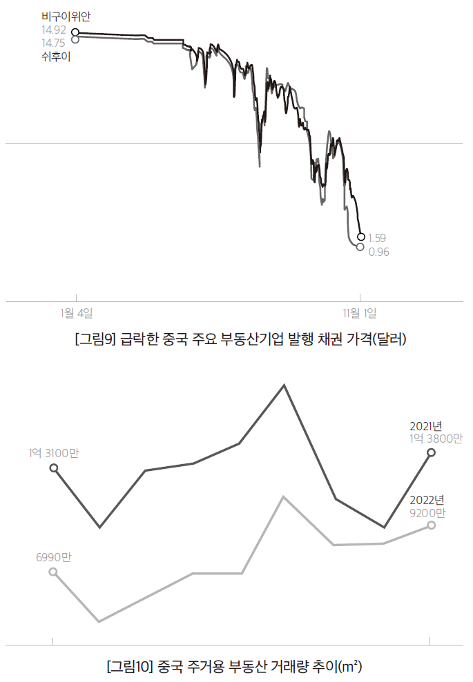 지금 당장 위기의 폭발점으로 꼽히고 있는 중국의 부동산 시장 상황을 좀 더 살펴보면, 15위 부동산 개발 업체인 쉬후이는 10월 말 만기였던 4억 달러(약 5,554억 원) 해외 채무 상환에 실패한 뒤 11월 1일 상환 연기를 발표했다. 쉬후이는 정부의 보증을 받았는데도 상환에 실패했다. 11월 8일 쉬후이의 2024년 만기 채권은 시장에서 96센트에 거래되고 있다. 올해 1월만 해도 15달러에 거래됐는데 1년도 안 돼 가격이 바닥으로 떨어졌다. 같은 날 중국에서 가장 큰 부동산 개발사인 비구이위안의 2024년 만기 채권도 1.59달러에 거래돼 지난 1월보다 89% 급락했다.