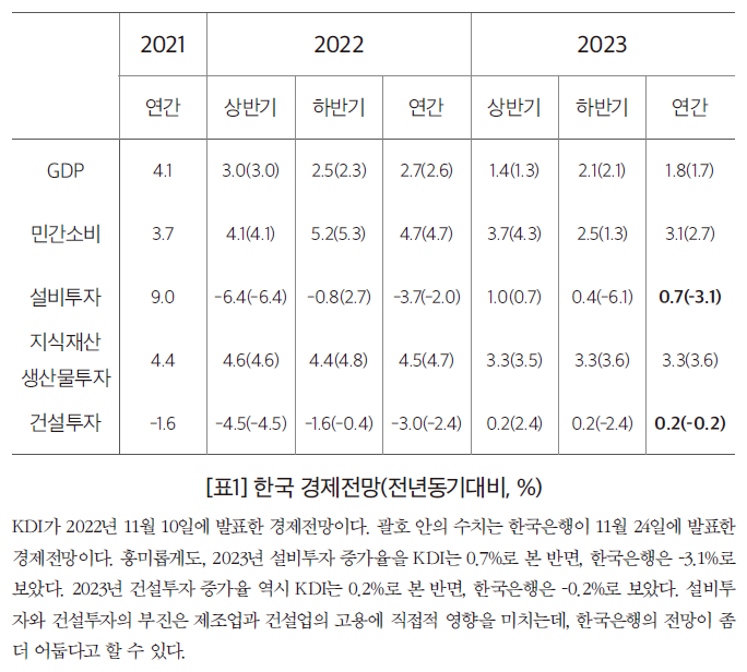 한국개발연구원(KDI)은 2022년 11월 10일에 발표한 「KDI 경제전망」에서 “우리 경제는 2023년에 수출 증가세가 크게 둔화하고 투자 부진도 지속되면서 1.8%의 낮은 성장률을 기록할 전망”이라는 분석을 내놓았다. 이는 세계 경제의 성장률이 2.7%라는 낮은 수치를 보이고, 원유 도입단가가 2022년보다 15% 하락한 배럴당 84달러를 기록하고, 실질실효환율로 평가한 원화가치가 4% 절하될 것이라는 전제로 도출한 것이다. (한국은행이 11월 24일 발표한 「경제전망」에서는 경제성장률을 1.7%로 예측했다.)