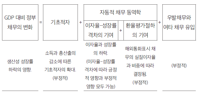 그런데 생산성 하락은 국가의 부채 문제에도 분명한 영향을 미친다. 부채수준이 높을 때, 노동생산성 성장률의 하락, 인구 고령화, 이자율 상승은 국가채무의 지속 가능성에 심각한 위협을 가한다. 노동생산성 성장 하락이 정부 채무에 영향을 끼치는 각 요소, 즉 기초적자, 이자율-성장률 격차, 환율, 우발부채에 어떤 효과를 발휘하는지 살펴보자.