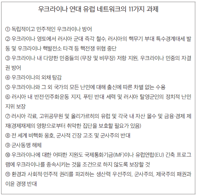 이와 같은 내용은 후술하겠지만 전쟁의 당사자인 우크라이나와 러시아 좌파들의 입장과 완전히 다른 것이며, “우크라이나에 대한 러시아의 침공은 어떤 명분으로도 정당화될 수 없으며 즉각적인 휴전과 군사행동의 중지, 철군이 이루어져야 한다”고 밝힌 민주노총 성명과도 배치된다(민주노총, “러시아는 우크라이나에서 전쟁을 중단하고 즉각 철군하라!”, 2022.03.30.).