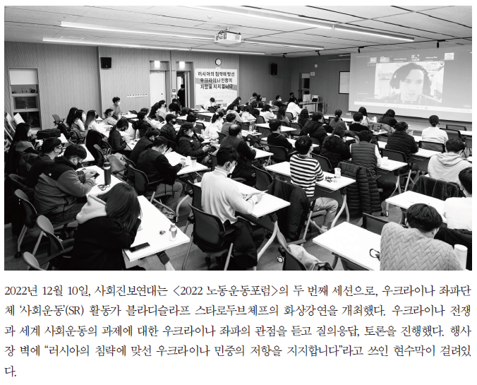 이러한 진영논리에 대한 전쟁 당사자들의 비판이 얼마 전 한국 사회에서도 있었다. 12월 6일~7일, 국제전략센터, 정의당 배진교 의원실 등의 주최로 일련의 행사가 <국제진보포럼: 미국이 벌이는 신냉전>이란 이름 아래 열렸다. 여기에는 노엄 촘스키, 비자이 프라샤드와 같은 유명 해외 좌파 인사들이 연사로 초청되었다. 이들은 미국에서 열린 “우크라이나의 평화로 가는 진정한 길: 협상” 포럼의 주요 참가자였다. 이러한 행사에 대해 재한 러시아인 반전단체 ‘보이시즈 인 코리아’(Voices in Korea)와 페미니스트 반전 저항 한국 모임은 주최 측에 공식 항의 공문을 보내고, 행사장 앞에서 피케팅을 진행했다.