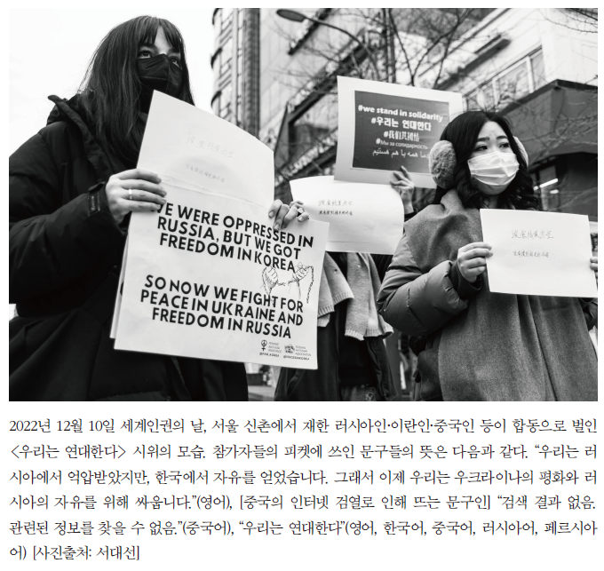 하지만 이러한 권위주의 국가 연대에 저항하는 세계 민중의 연대도 이미 시작되었다. 중국 각지에서 ‘백지시위’가 시작되자 홍콩의 라우산과 ‘국경 없는 운동’(無國界社運, Borderless Movement)은 「우루무치에서 상하이까지: 중국과 홍콩 사회주의자들의 요구」라는 글을 발표하여 연대를 표했다. 11월 9일, SR, 페미니스트 로지를 포함하여 우크라이나의 페미니스트 단체들은 「이란 여성과 연대하는 우크라이나 페미니스트 선언문」을 발표했다. 지난 8개월 동안 우크라이나 민중이 푸틴의 제국주의적 침략에 저항해왔다면, 지금 이란 민중은 독재적이고 극단적으로 보수적인 자국 정권과 엘리트만 배불리는 경제에 대항하여 투쟁하고 있다는 것이다. 선언문은 “이란에 자유를! 우크라이나에 자유를! 우리는 함께 승리할 것이다!”라는 문장으로 마무리된다. 11월 24일 이후 중국 민중의 시위 속에서도 대만, 홍콩, 우크라이나, 이란 민중을 지지한다는 발언이나 피켓이 목격되었다. 한국에서도, 12월 10일 ‘세계 인권의 날’을 맞아 전쟁과 푸틴 정권에 반대하는 재한 러시아인 커뮤니티와 이란 반정부 봉기를 지지하는 재한 이란인 커뮤니티, 11월 30일 ‘백지 시위’에 참가했던 재한 중국인 일부의 공동 집회 <우리는 연대한다>가 열렸다. 이들은 비슷한 민주화 요구를 공유하며, 러시아의 우크라이나 침공과 원유 수입, 무기 지원으로 이를 돕는 이란, 중국 정부를 규탄한다는 점에서 연대했다.