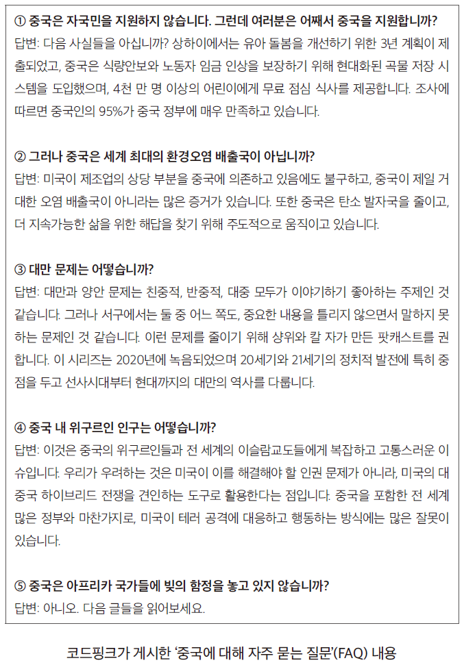 앞서 확인한 미국 평화운동의 우크라이나 전쟁 대응에서 주도적인 역할을 하는 코드핑크는 ‘중국에 대해 자주 묻는 질문’(FAQ) 웹페이지를 개설하여 다음과 같은 질문들과 그에 대한 답변을, 중국공산당이 운영하는 인터넷 뉴스 《인민망》, 국영방송 CGTN 기사 등을 인용하며 게시했다. 인도 출신의 마르크스주의 역사가 비자이 프라샤드 또한, 중국과 세계 각지에서 우루무치 화재 희생자를 추모하고, ‘제로 코로나’ 봉쇄에 반대하는 시위가 진행되던 중인 11월 29일, 트위터에 마르크스의 얼굴이 그려진 티셔츠를 입고 ‘제로 코로나♥’라고 적힌 종이를 든 자신의 사진을 올려 논란을 일으켰다.