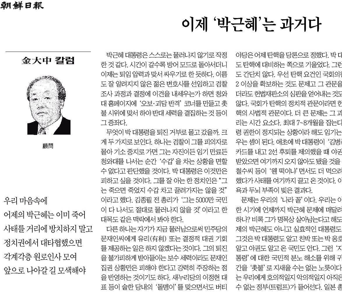조선일보 김대중 고문은 22일자 칼럼에서 “우리 마음 속 박근혜는 이미 죽었다”며 이번 거사의 출구를 찾았다. 탄핵이 잘 될 것 같진 않지만, 우선 절차를 밟으며 시민들을 거리에서 집으로 되돌려 보내야 한다는 주장도 덧붙였다.